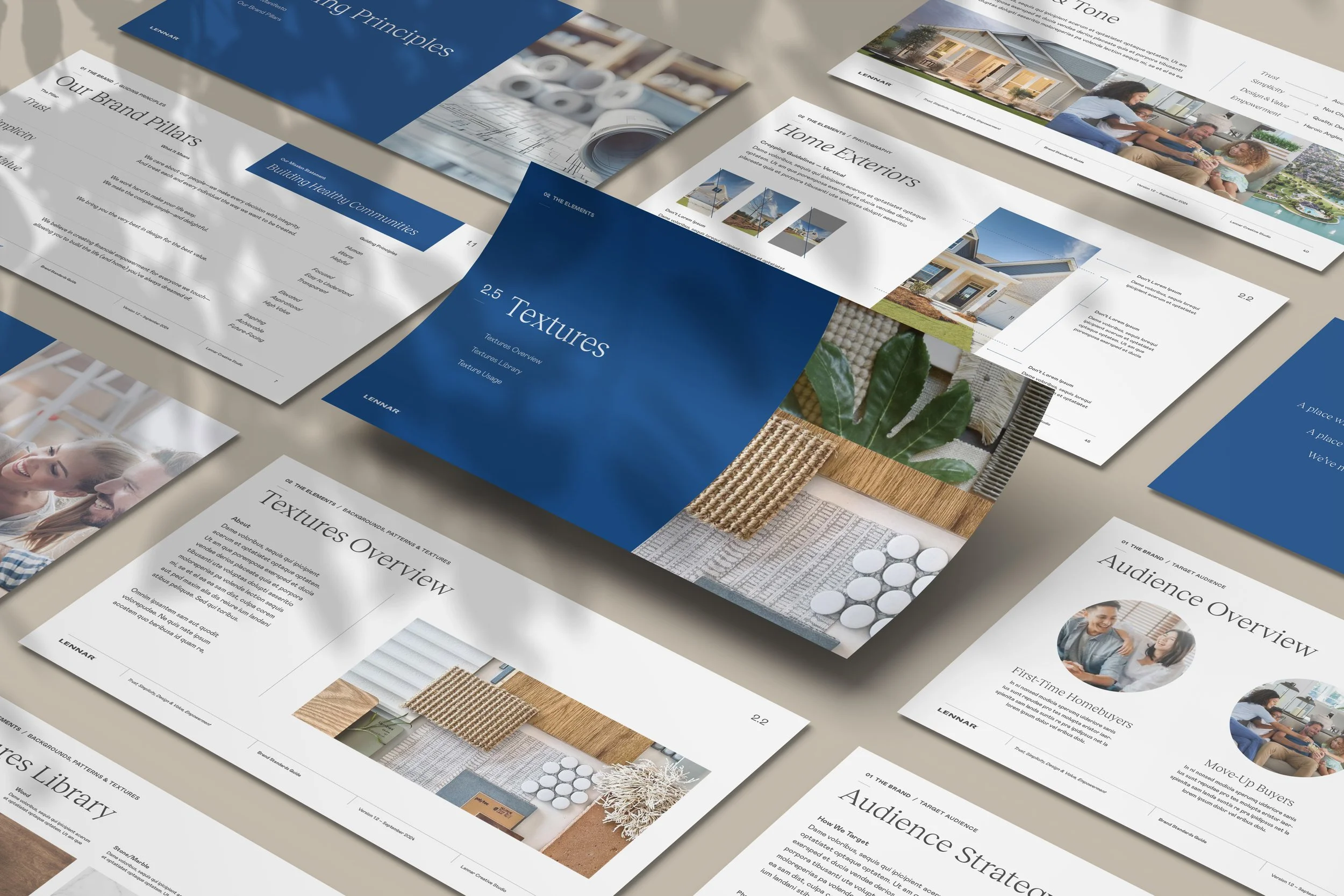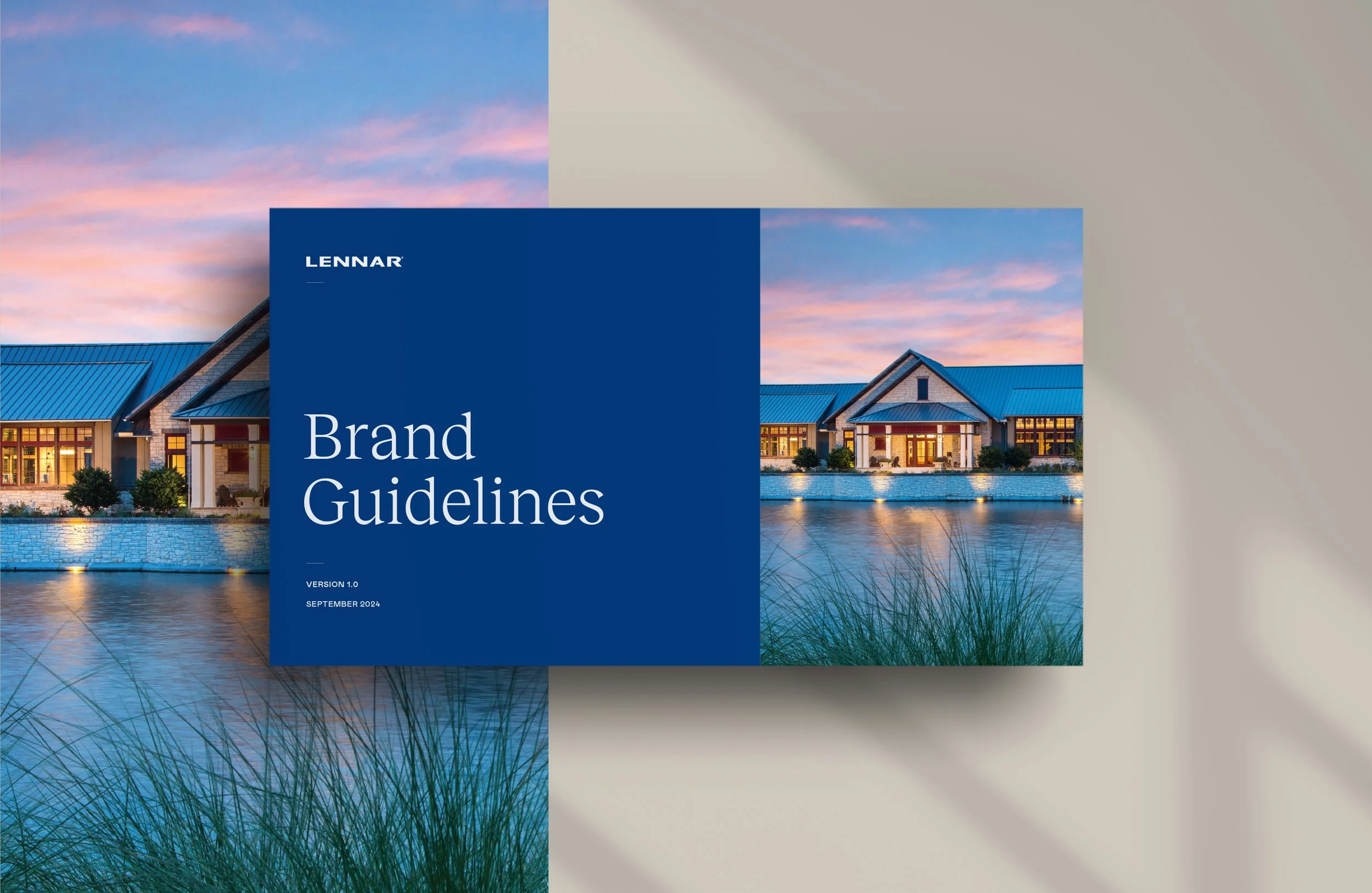 This extensive project involved a full-scale brand refresh for renowned home builder, Lennar—triggered by the need for a brand repositioning and refresh in a growing, competitive market. The project included strategizing new brand pillars, establishing a much more extensive (and warm) color palette, introducing new, textile-inspired patterns, expanding on brand voice, providing a much-needed guide for photography, and so much more. This was all summarized into a curated 100-page standards guide and distributed nationally.